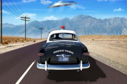 1950s UFO Desert Chase – New Retro Sci-Fi Art “Ford patrol car vs. flying saucer, Nevada 1953—who ya got?” If you’ve ever dreamed of cruising down a lonely Nevada desert highway in the dead of night, ...